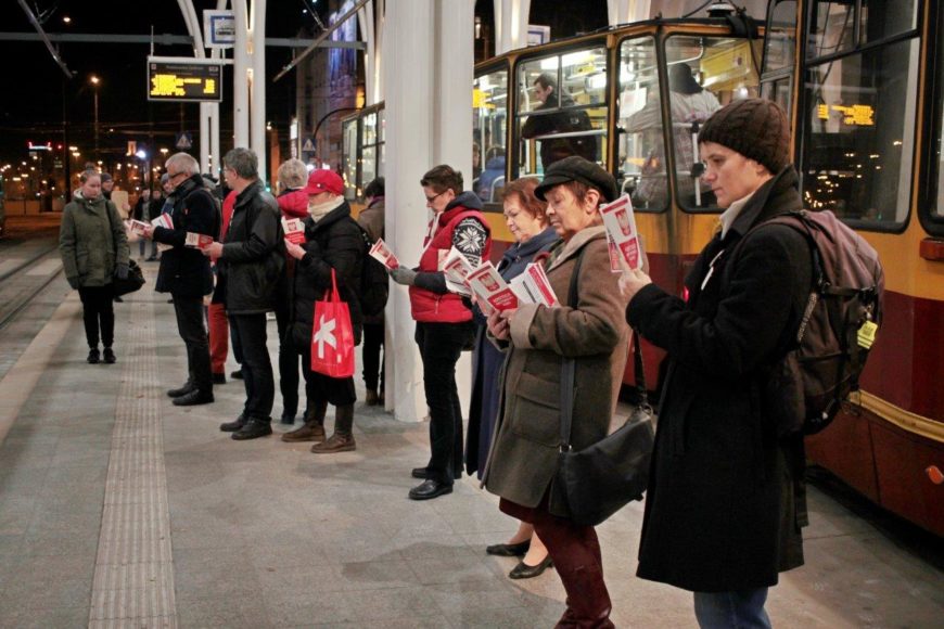 Jak zwykle kilkunastu KOD-erów łódzkich stawiło się na peronach po to, by przy akompaniamencie Preambuły KOnstytucji czytanej przez Jerzego Radziwiłowicza rozlegającej się z głośnika, publicznie czytać Konsytucję RP.