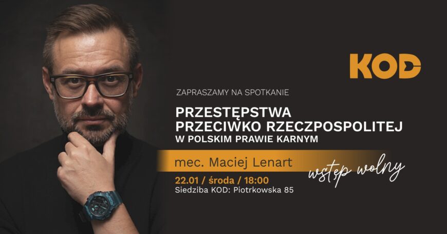 Tym razem wysłuchamy Mecenasa Macieja Lenarta, który opowie nam o przestępstwach przeciw Rzeczpospolitej Polskiej w świetle rozdziału XVII Kodeksu Karnego. Posłuchamy o usunięciu przemocą konstytucyjnego organu RP, zamachu na Prezydenta, czynnej napaści na Prezydenta, zdradzie dyplomatycznej, znieważeniu Narodu lub Rzeczpospolitej Polskiej.