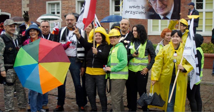 Zbiórka przed siódmą rano. Niebo pochmurne, aura niekomfortowa a ludzie się schodzą radośni jacyś, uśmiechnięci, serdecznie się witają. Żółte kaski na głowach, żółte łódeczki przygotowane żeby dumnie zaistnieć nad flagami. I ten najbardziej nasz transparent z portretem prof. Bartoszewskiego i słynnym „warto być przyzwoitym”. Jedziemy, Gdańsk na nas czeka. A my na Gdańsk.
