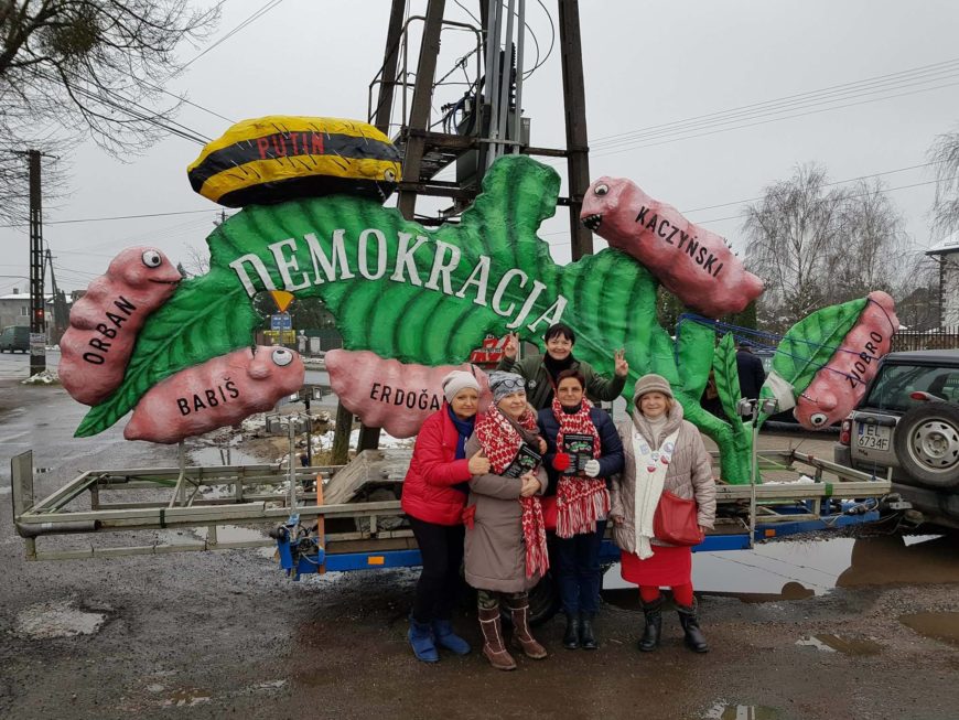 Na targowisku w Brzezinach byłyśmy przed dziesiątą i w oczekiwaniu na wsparcie w postaci Liścia Demokracji pożeranego przez gąsienice populizmu rozdawałyśmy Dekodery i przygotowywałyśmy ludzi na przyjazd instalacji.