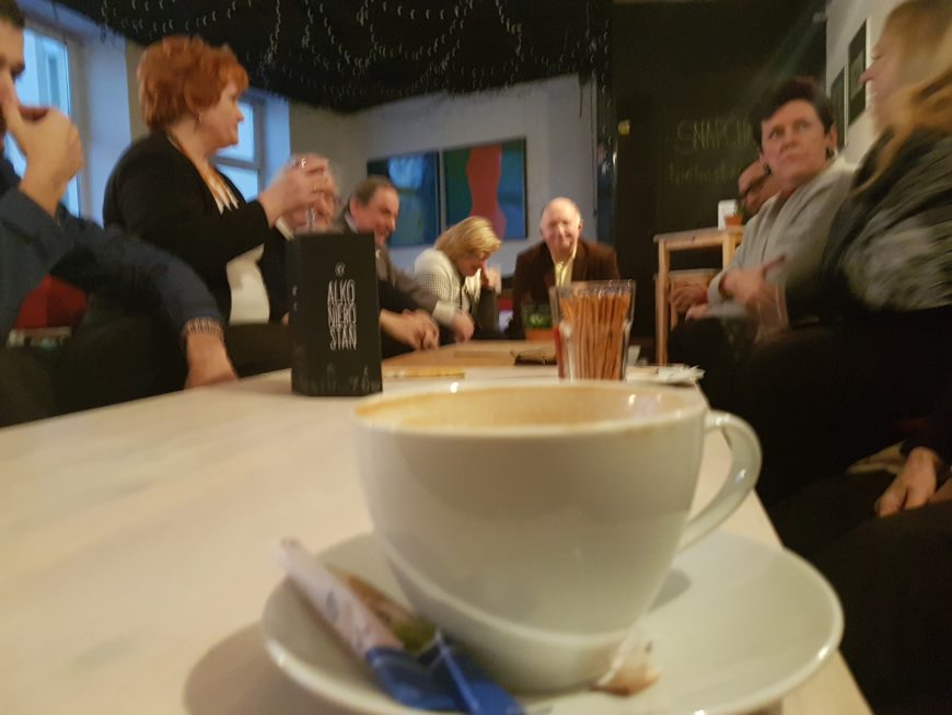 Upał zelżał i z lekka zamarznięci dochodzili kolejni „kawiarenkowicze”. Herbata rozgrzewająca, rozrastający się stół, dostawiane krzesła… I uśmiechy. Był czas do wspomnień na początek. Wielu z nas było na tym pierwszym spotkaniu w Niebostanie. „Ja siedziałam tu, ja tam a ja stałem tam pod ścianą”.
