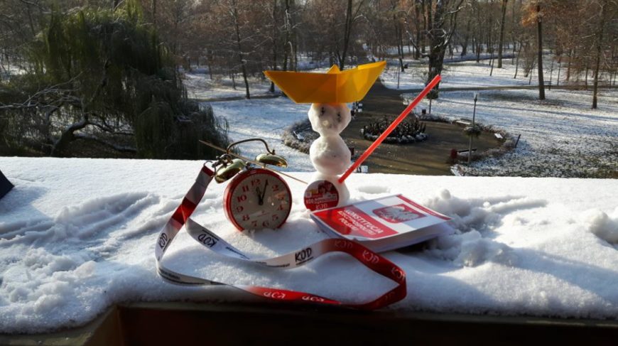 Na miejscu – niespodzianka. Z przejeżdżającego samochodu marki BMW wyskoczył kierowca z okrzykiem „Ooo, KOD!”… W pierwszej chwili myśleliśmy, że to jakiś miłośnik PiS-u, ale okazało się, że wręcz przeciwnie – Paweł z Poznania wraz z żoną Bożeną są koderami, biorącymi udział we wszystkich manifestacjach tak KOD-u, jak i Dziewuch! Po przemiłej rozmowie nastąpiła seria zdjęć i obdarowanie małżeństwa znaczkami z naszego wczorajszego Marszu Niepodległości.