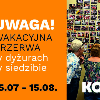 Informujemy, że w dniach 15.07 – 15.08 odpoczywamy i wstrzymujemy spotkania / dyżury w siedzibie. Zapraszamy już 21 sierpnia! W sprawach ważnych (np. wypożyczenie sprzętu itp) prosimy o kontakt telefoniczny: 729 055 219 (14.00 – 18.00)
