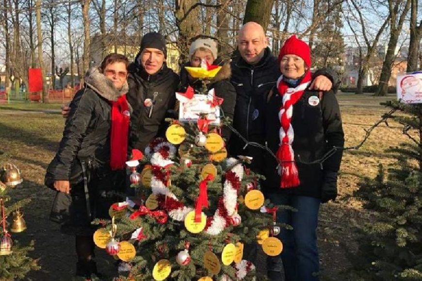 W tym roku jako KOD zostaliśmy zaproszeni, do udekorowania naszej kod choinki, z zaproszenia oczywiście skorzystaliśmy i ubraliśmy piękne drzewko z oryginalnymi życzeniami wpisanymi na ozdobach. Małgosia przygotowała grafikę oraz życzenia, Dorota z Wojtkiem nocą wycinali i przygotowywali ozdoby, dziewczyny ze Zgierza przygotowały, bombki z napisem kod, a my w liczbie 5 osób stawiliśmy się w parku, aby udekorować nasze zakodowane świąteczne drzewko.