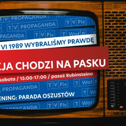 ZAPRASZAMY: KIEDY: 04.06 (sobota) o 15.00 – 18.00 GDZIE: pasaż Rubinsteina W PROGRAMIE: Galopująca inflacja Koło fortuny Wodza Klepanie biedy Konkurs pasków TVP Bicie piany i przeginanie pały Obietnic wiele Przebitki ze studia TVPic a… Zenek… nie zaśpiewa…