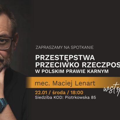 Zapraszamy na kolejne spotkanie z naszym gościem. Tym razem wysłuchamy Mecenasa Macieja Lenarta, który opowie nam o przestępstwach przeciw Rzeczpospolitej Polskiej w świetle rozdziału XVII Kodeksu Karnego. Posłuchamy o usunięciu przemocą konstytucyjnego organu RP, zamachu na Prezydenta, czynnej…