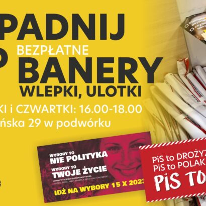 Wpadnij do naszej siedziby (ul. Gdańska 29, prawa oficyna) w każdy wtorek i czwartek w godz. 16.00 – 18.00 i pobierz bezpłatne materiały: bannery (2×1,m), plakaty, magnesy na samochód, wlepki, ulotki. mamy demokrację do wygrania w najbliższych wyborach…