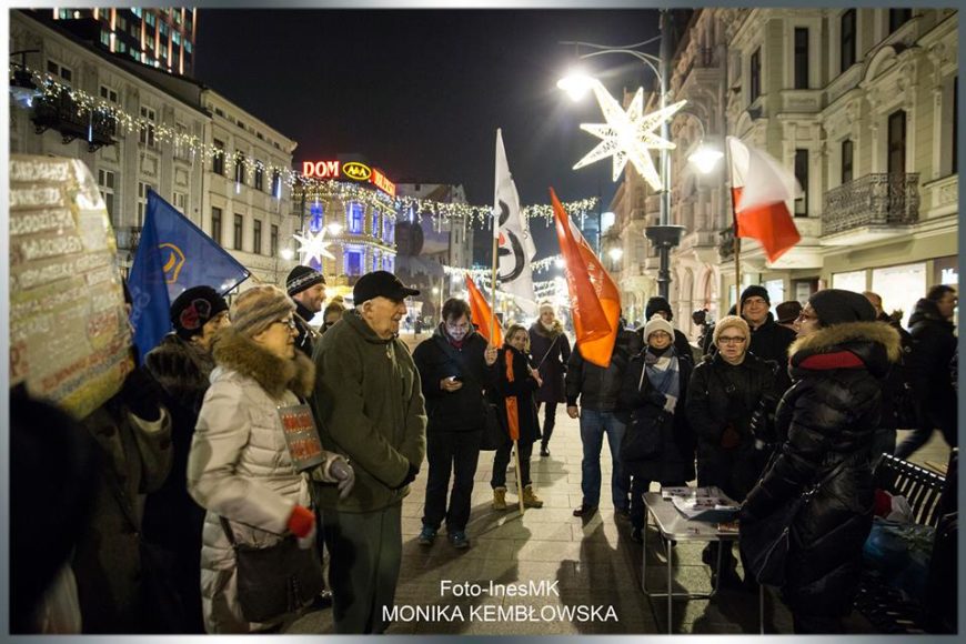 Dziś o 17:00 po raz pierwszy spotkaliśmy się pod biurem PiS na nowej inicjatywie łódzkiego KOD – Codzienniku Demokratycznym. To nowa nazwa spotkań, które już od kilku dni odbywają się pod siedzibą PiS. Będziemy codziennie wieczorem spotykać się w tym miejscu, by zamanifestować nasz sprzeciw wobec tego, co minionego dnia zrobiła partia rządząca, a także by przypominać ich wcześniejsze przewiny. Dodatkowo, codziennie będziemy łączyć się z którąś z osób manifestujących w Warszawie – z posłami opozycji okupującymi salę plenarną lub z protestującymi przed Sejmem.