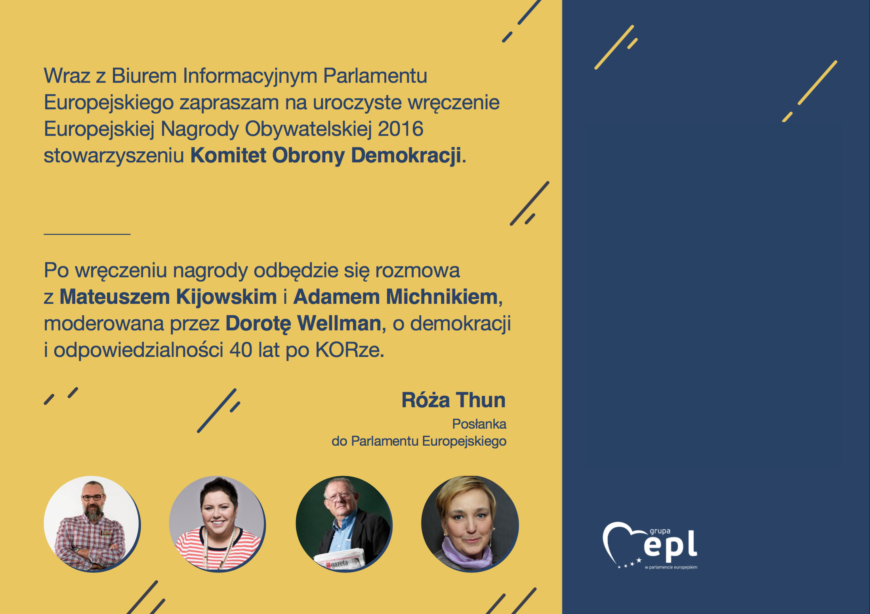 Cóż, że przez polityków władzy bywamy nazywani najgorszym sortem, jeśli docenia nas reszta świata. Komitet Obrony Demokracji został w tym roku wyróżniony Europejską Nagrodą Obywatelską, a silna reprezentacja Regionu Łódzkiego została przez europosłankę Różę Thun zaproszona na uroczystość wręczenia nagrody.