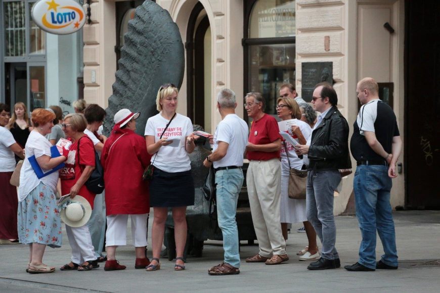 7. Flashmob łódzkich KOD-erów tym razem miał miejsce nieopodal słynnego fortepianu Rubinsteina na ulicy Piotrkowskiej (30 czerwca 2016, godz. 18:00). Ok. 20 „flashowców” zebrało się wokół czytającego Konstytucję, czytając i podając sobie jej egzemplarze, tworzyli tłum wokół Ustawy zasadniczej.