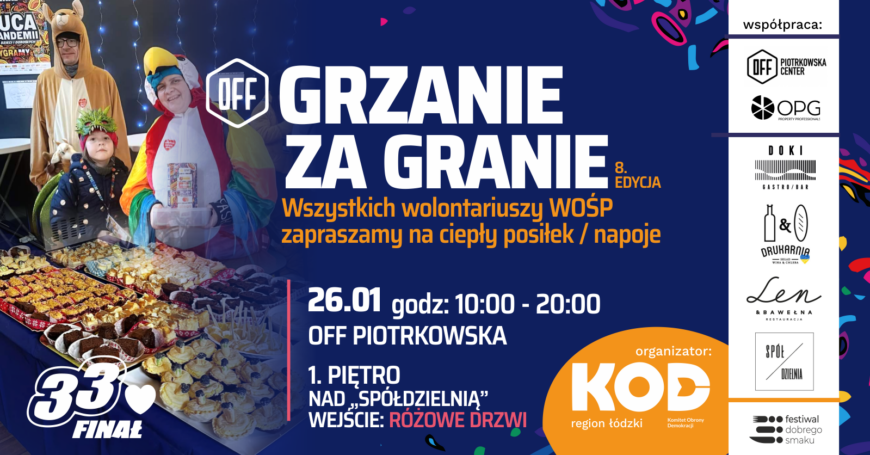 W najbliższą niedzielę, 26 stycznia, w godzinach 10:00–20:00 na Off Piotrkowska w Łodzi (ul. Piotrkowska 138/140, 1. piętro nad „Spółdzielnią”, wejście przez różowe drzwi) serwowane będą rozgrzewające dania i smakołyki dla wszystkich kwestujących.