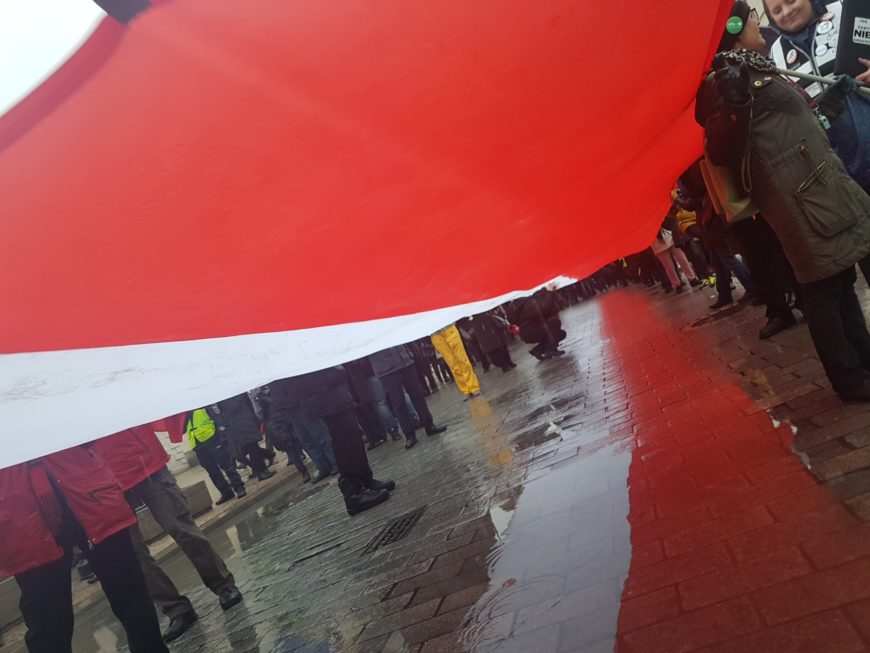 Planując wyjazd na sobotnią manifestację „Wolne Sądy, wolne samorządy” sprawdzaliśmy prognozę pogody. Mieliśmy świadomość, że nie dopieszczą nas warunki atmosferyczne. Jednak rzeczywistość przerosła wyobrażenia. Było naprawdę zimno, wiatr popędzał deszczowe krople, które smagały każdy odkryty kawałek ciała. Przenikały przez najbardziej przeciwdeszczowe powłoki. Woda, wszędzie tylko lodowata woda. Nasiąkaliśmy nią jak gąbki, które ktoś złośliwie na końcu wrzucił do lodówki.