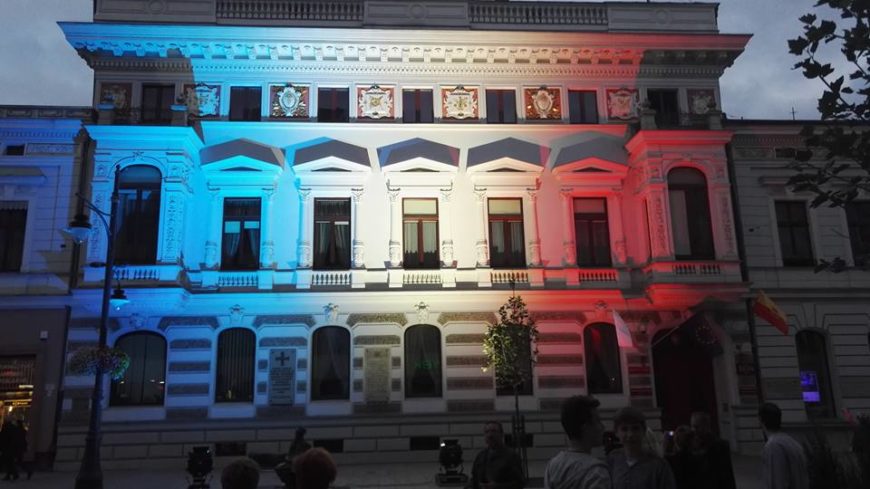 O godzinie 21.30 KODerzy zebrali się natomiast wraz z innymi łodzianami pod Urzędem Miasta na ul. Piotrkowskiej 104, aby pod budynkiem pięknie oświetlonym w barwy flagi francuskiej złożyć świece i znicze. Spotkaliśmy tam uroczą młodzież francuską (lub francuskojęzyczną), która przyszła zaśpiewać „Marsyliankę” i inne pieśni tego narodu. Złożyliśmy im także kondolencje i wyrazy solidarności. Ponieważ byli zainteresowani naszymi oznaczeniami, zostawiliśmy im na pamiątkę znaczki oraz jedną flagę KODu.
