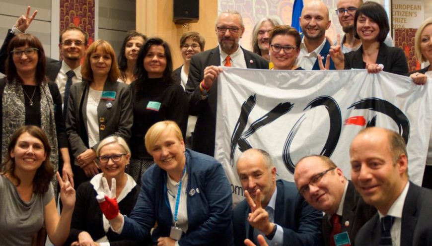 Wreszcie jednak nadchodzi moment, na który wszyscy czekaliśmy. Commitee for the defence of democracy nominated by Róża Thun, słyszymy, i na scenę wchodzi, w imieniu nas wszystkich, Mateusz Kijowski. Mówi o tym, co dzieje się w Polsce, o zagrożonej demokracji, o działaniach rządu i prezydenta. Cała sala słucha, reporterzy nagrywają. Mateusz pięknie mówi o tym, że to nagroda dla całego ruchu, kamery na jego znak pokazują na widowni nas, działaczy. Czuję, że mam w oczach łzy i nie wiem, czy to wzruszenie tym, jak wiele osiągnęliśmy przez 10 miesięcy, czy smutek, że muszę słuchać takich słów o moim państwie, z którego bardzo chciałabym być dumna. Brawa, Mateusz schodzi ze sceny, pokazuje nam nagrodę. Machamy flagą KOD. Nagrodę odbierają kolejni laureaci,  ceremonia dobiega końca. Jeszcze pamiątkowe zdjęcia, na końcu korytarza czekają już na nas reporterzy z różnych programów telewizyjnych i radiowych. Stajemy wszyscy z flagą KOD i biało-czerwoną rękawiczką, którą zna już cała Polska. Mateusz i pani Róża mówią parę słów, na koniec skandujemy „wolność – równość – demokracja”. Jesteśmy w tej chwili szczęśliwi, że w Europie dostrzegane są nasze starania, choć oczywiście wolelibyśmy nie mieć nigdy powodu do protestów i zakładania specjalnego ruchu budującego od podstaw społeczeństwo obywatelskie.
