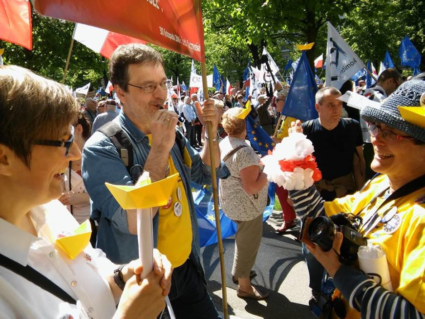 Na początku autokarów miało być pięć, potem osiem, a skończyliśmy z dziewięcioma. Oczy się śmiały, gdy sznur autobusów jechał autostradą Wolności do stolicy. A zapisy trwały dzień i noc, ostatnie naprawdę na ostatnią minutę. Zarządzał nimi jak zawsze niezłomny Sławek Sypiański, ale przygotowania były znacznie szersze. Spotkanie Kawiarenek KODu w klubie Szafa było poświęcone składaniu żółtych łódeczek, które potem dumnie nieśliśmy zatknięte na kijach i flagach. Te łódeczki zresztą znakomicie sprawdzały się jako wyznacznik Łódzkiego w tłumie. Były także koszulki, specjalne znaczki okolicznościowe, była wreszcie reklama w bibule DeKODer, przygotowana przez Elę Sokolską. Łódzka ekipa wsparła także silnie straż KODu oraz animację.
