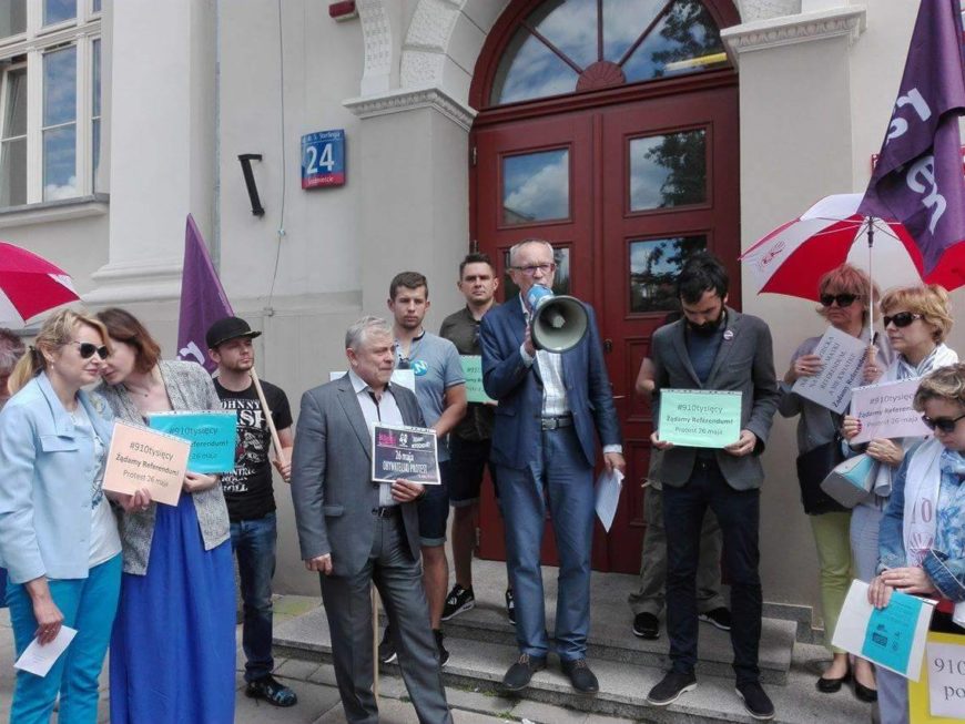 „910 tysięcy. Żądamy referendum!” to hasło, pod którym spotkaliśmy się w całym kraju na pikietach 26.05. W Łodzi protestowaliśmy przed budynkiem I Gimnazjum.