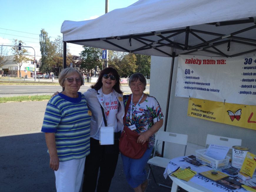 Na samym początku podchodzili przeciwnicy KOD-u i nawet zaczęli nas wyzywać. Starałyśmy się być grzeczne i uśmiechnięte. Nie trwało to długo, bo później tylko podchodzili zwolennicy KODu i były bardzo sympatyczne rozmowy. Jedna pani przyniosła deklarację,  inna pani wrzuciła do puszeczki kilka złotych. Marta przyjechała z dziećmi  o 18.00,  zabrać namiot i tak nasz dyżur zakończył swoją działalność PiKODu na Widzewie.