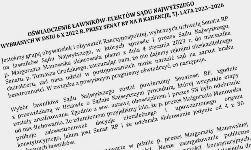 Jesteśmy grupą obywatelek i obywateli Rzeczypospolitej, wybranych uchwałą Senatu RP na ławników Sądu Najwyższego, w których sprawie I prezes Sądu Najwyższego, p. Małgorzata Manowska skierowała pismo z dnia 4 stycznia 2023 r. do marszałka Senatu, p. Tomasza Grodzkiego, zarzucając nam, że nie dajemy rękojmi nieskazitelnego charakteru, zaś nasz udział w postępowaniach może narazić sąd na zarzut braku bezstronności. W związku z powyższym pragniemy oświadczyć, co następuje.