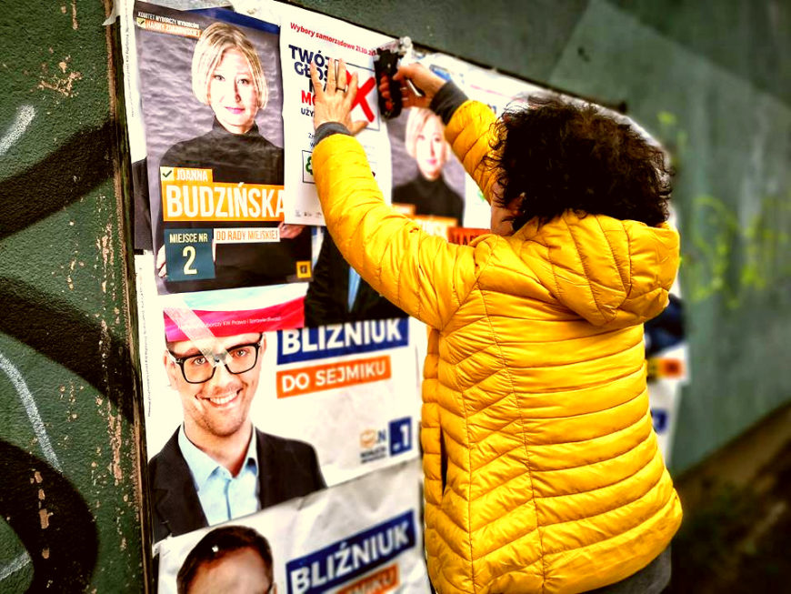 Dzisiaj udało nam się kilkanaście miejsc ładnie pozaklejać naszymi „Masz 3 głosy” i „Wstyd nie iść na wybory” oraz plakatami Fundacji Batorego „Twój głos ma moc”. Korzystaliśmy z tablic wyborczych i miejsc, w których można naklejać – wszystko lege artis. Przy okazji dopisaliśmy do oficjalnego spisu tablic wyborczych kilka miejsc, których w wykazie nie ma, a w realu są. Przy okazji także pozaglądaliśmy pod plakaty kandydatów komitetów, których nazwy nie wymienię i w czterech miejscach okazało się, że nakrywają plakaty zupełnie innych osób, często naszych znajomych. No i przy okazji pozbieraliśmy odklejone deszczem i pozrywane wiatrem strzępy innych plakatów poniewierające się pod tablicami (nie, od razu dementuję: nie zrywaliśmy plakatów, które nas nie cieszyły!).
