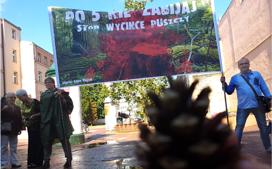 Byliśmy dziś pod siedzibą PiS, a potem w pasażu Schillera protestować przeciw zabijaniu Puszczy. Pomimo deszczu, czasem ulewnego staliśmy z transparentami, rozdawaliśmy ulotki, milczeliśmy. Głos oddaliśmy Puszczy. Z głośnika płynęły odgłosy mieszkańców lasu – ptaki śpiewały, szumiał wiatr. Aż wdarł się w to warkot pił motorowych, z hukiem padały drzewa, pękały konary. Puszcza umierała by ustąpić miejsca warczącym silnikom samochodów, klaksonem znaczących teren.