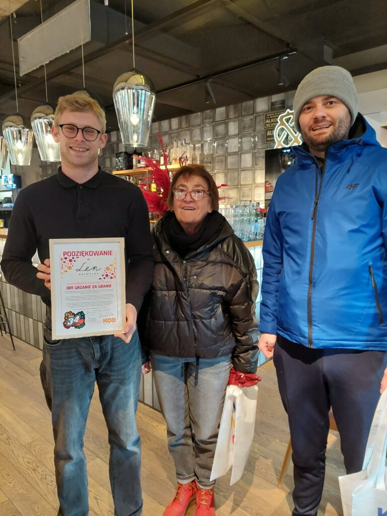 Chciałabym jeszcze raz bardzo serdecznie podziękować wszystkim, którzy zaangażowali się w akcję Grzanie za granie. Wiem, jak olbrzymią pracę włożyli nasi wolontariusze (z niezmordowaną Dorota na czele), ale sami nie dalibyśmy rady nakarmić kilkuset osób. Dlatego byliśmy podziękować restauracjom Doki, Len i Bawełna, Spółdzielnia i Drukarnia, które nas wspierały w aprowizacji. Ponieważ nie udało nam się dotrzeć do OPG z podziękowaniami za udostępnienie lokalu na OFF Piotrkowska, więc wysłaliśmy umyślnego, niestety zdjęć z wręczania tego dyplomu nie mamy.