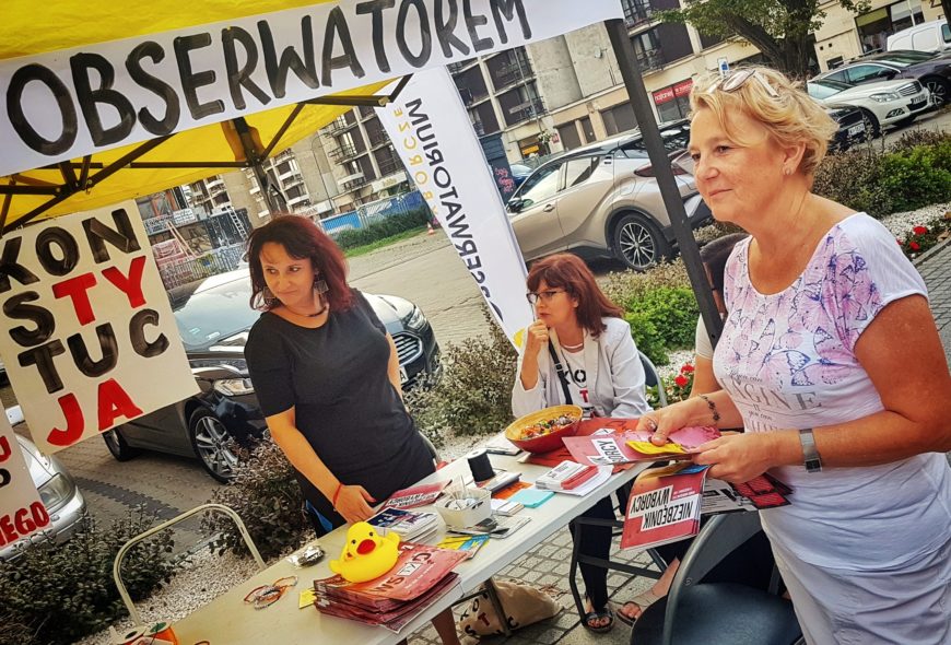 Dziś właśnie mamy taki niezwykły czas zrównania czasu trwania dnia i nocy i oznacza to, że nic już nie pomoże: jesień przyszła. W tym roku u nas jest to dzień podwójnie wyjątkowy, bo do wyborów został nam równy miesiąc, więc nie możemy już ani chwili zmarnować i jeżeli ktoś jeszcze nie uaktywnił się, to już jest najwyższa pora to zrobić. Można na przykład zostać OBSERWATOREM SPOŁECZNYM na wyborach. O tym i o innych obywatelskich prawach i obowiązkach rozmawialiśmy dziś na PIKODZIE (Punkt Informacyjny KOD). Odpowiedni napis na namiocie sprawia, że zdarza się, że ludzie sami podchodzą, by zapytać o szczegóły.