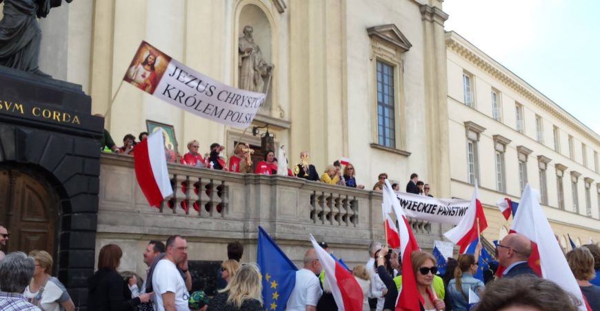 A rzeka ludzi z KOD-em płynie, widoczni są ci z łódkami, jest głośno, skandowane hasła o równości, wolności, tolerancji. Te same hasła co przed prawie pięćdziesięciu laty i to samo Krakowskie Przedmieście. Ten sam kościół Św. Krzyża. Na schodach kościoła, tych samych po których uciekała łączniczka z AK przed SS i młody człowiek przed MO, rozpostarty biały transparent z napisem „Jezus Chrystus Królem Polski”, a Chrystus w koronie cierniowej co Mu ją ludzie założyli dźwiga ciężki krzyż na schodach kościoła w drodze na Golgotę. Obok stoją kobiety i mężczyźni jest ich kilkoro, odziani w szaty purpurowe z krzyżami i orłami białymi. Na balustradzie wystawione monstrancje, czy z ciałem Chrystusa? Ci współcześni krzyżowcy trzymają wyciągnięte dłonie z różańcami i krzyżami jakby chcieli przekląć rzekę, przekląć historię, łączniczkę z AK, studentów z ’68 i innych co o wolny Kraj walczyli. I rzeka nagle stanęła, zaniemówiła, zaniemówił też pan, co go matka pod sercem nosiła dla przyszłej wolnej Polski. Ruszyli, ale jacyś smutniejsi, zszokowani widokiem przed Świętym Krzyżem, a na jezdni tysiące małych karteczek z napisem „Zła zmiana”. Idą po nich demonstranci, jakby chcieli zatrzeć tę zmianę którą zgotowała nowa władza PiS-u pod wodzą Jarosława Kaczyńskiego. I już nie ma tej radości, jest smutek i żal do tych co szargają świętości, a przykład podjętej krucjaty idzie od samego prezesa partii co ma w nazwie Prawo i Sprawiedliwość i stało się bardzo aktualne przysłowie, „Modli się pod figurą, a diabła ma za skórą.”