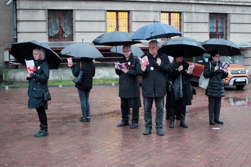 W poniedziałek 24 października o godz. 17:00 na Piotrkowskiej 143 pod siedzibą PiS odbędzie się manifestacja „Zatrzymajmy fanatyków”, tzw. parasolkowy protest, współorganizowany przez Łódzkie Dziewuchy Dziewuchom i Inicjatywę Polską. Wyprzedzając tę manifestację kilkunastoosobowa grupa Flash moba zapraszała na Czarny Protest gromadząc się wokół czytania ciągle obowiązującej, choć osłabianej, Konstytucji Rzeczpospolitej Polskiej. Z niewidocznego głośnika rozlegały się dźwięki recytacji podniosłego tekstu Preambuły w wykonaniu Jerzego Radziwiłowicza oraz kilku artykułów Konstytucji czytanych przez jednego z aktorów scen łódzkich. To były te artykuły, przeciwko którym najpewniej występują zmiany proponowane w prawie polskim przez fanatycznych „obrońców życia”, dla których życie realnych kobiet polskich (naszych matek, córek, żon, sióstr, koleżanek) i ich zdrowie jest nieważne.