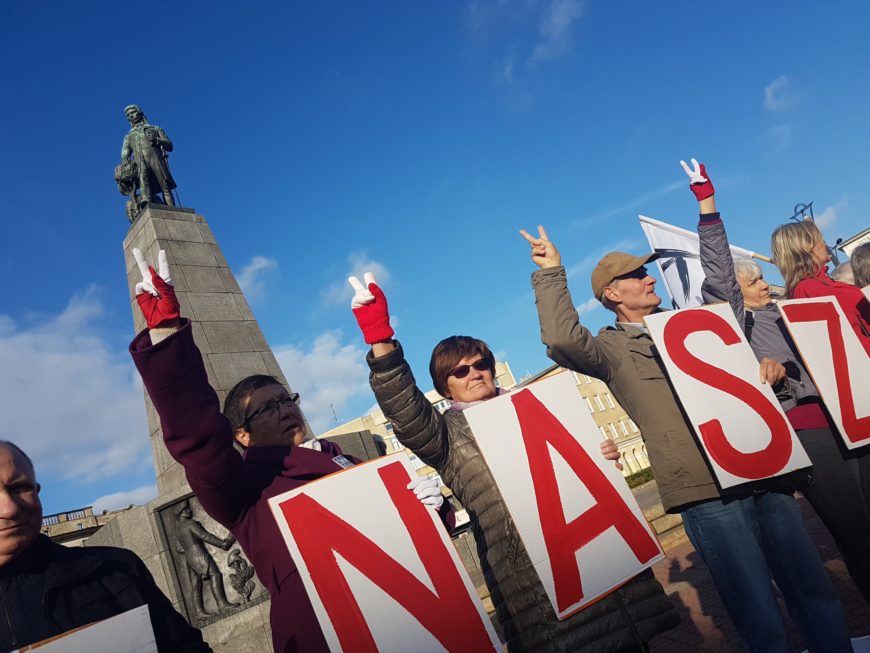Stajemy wzdłuż ulicy Zachodniej z napisem „PREZYDENT ŁAMIE KONSTYTUCJĘ”, flagami Unii, Polski i KOD. Rozbrzmiewa Oda do Radości, po niej melorecytacja PREAMBUŁY KONSTYTUCJI w wykonaniu Jerzego Radziwiłowicza. Zmieniamy napis na „NASZĄ SIŁĄ SOLIDARNOŚĆ”. Rozlega się „hymn” Literiady. Cała nasza akcja wzbudza zainteresowanie przechodniów, pasażerów komunikacji miejskiej, jak i użytkowników samochodów prywatnych.