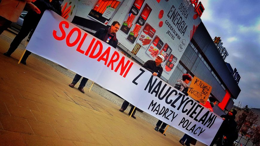 Solidarni z nauczycielami – przemaszerowaliśmy dziś wokół najbardziej znanego przystanku autobusowego w Łodzi, tzw. Stajni Jednorożców.