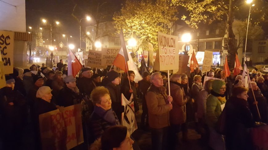 Ale byli też tacy, którzy próbowali zakłócić manifestację wulgarnymi okrzykami. Byli to młodzi zamaskowani mężczyźni , sądząc po stroju, prawdopodobnie ze środowiska Obozu Narodowo – Radykalnego. Spod Urzędu Miejskiego zebrani przemaszerowali na Stary Rynek, gdzie odbyła się druga część wiecu. Na trasie marszu ustawiła się kilkuosobowa kontrmanifestacja młodych ludzi, którzy wcześniej pokrzykiwali na zebranych.