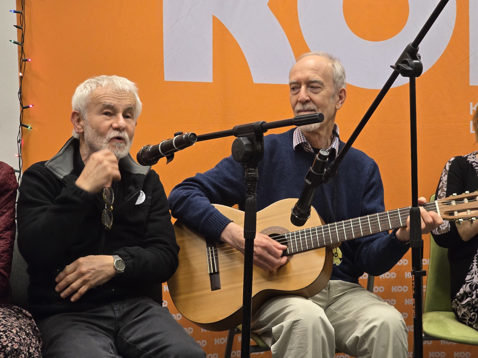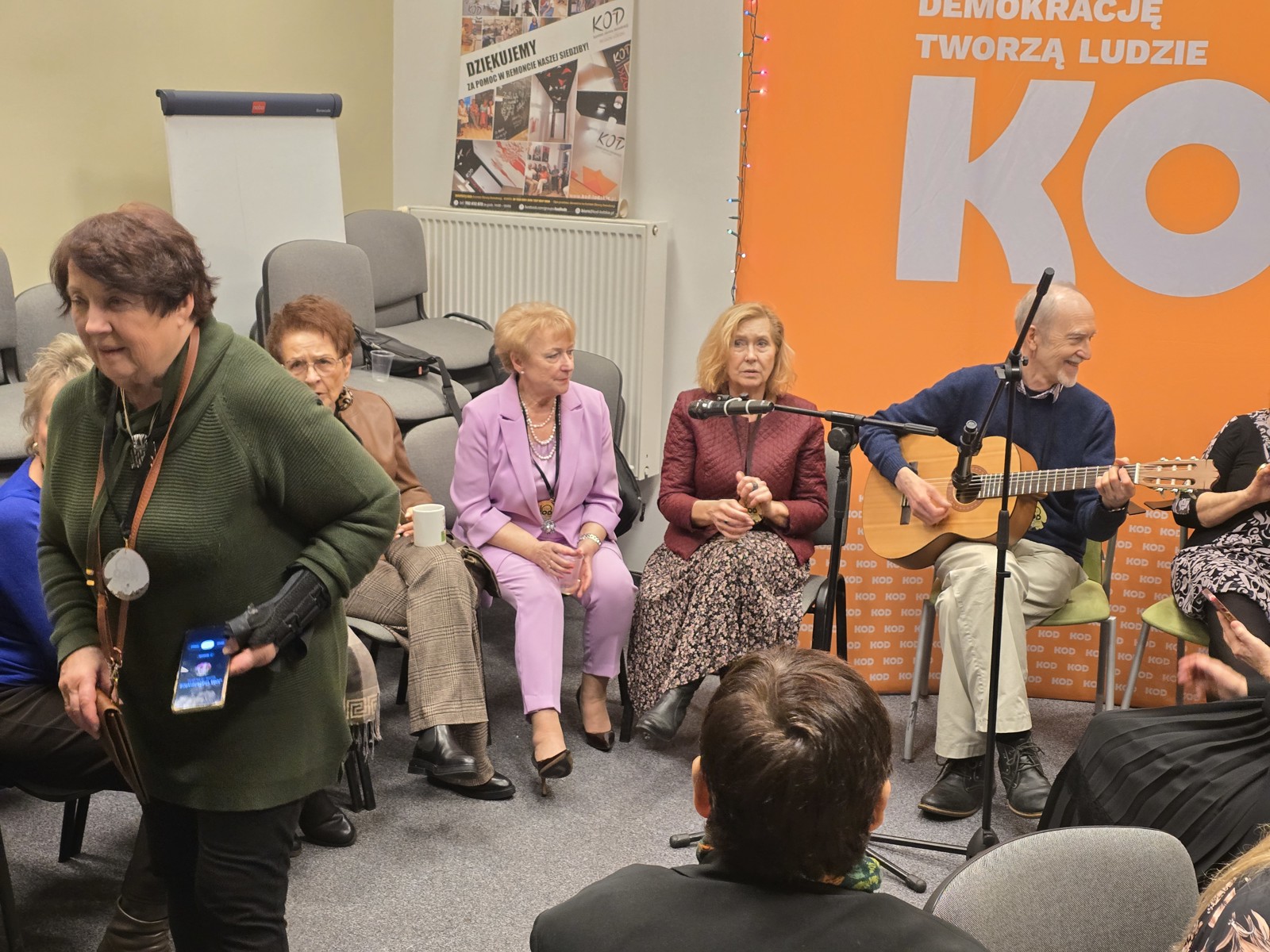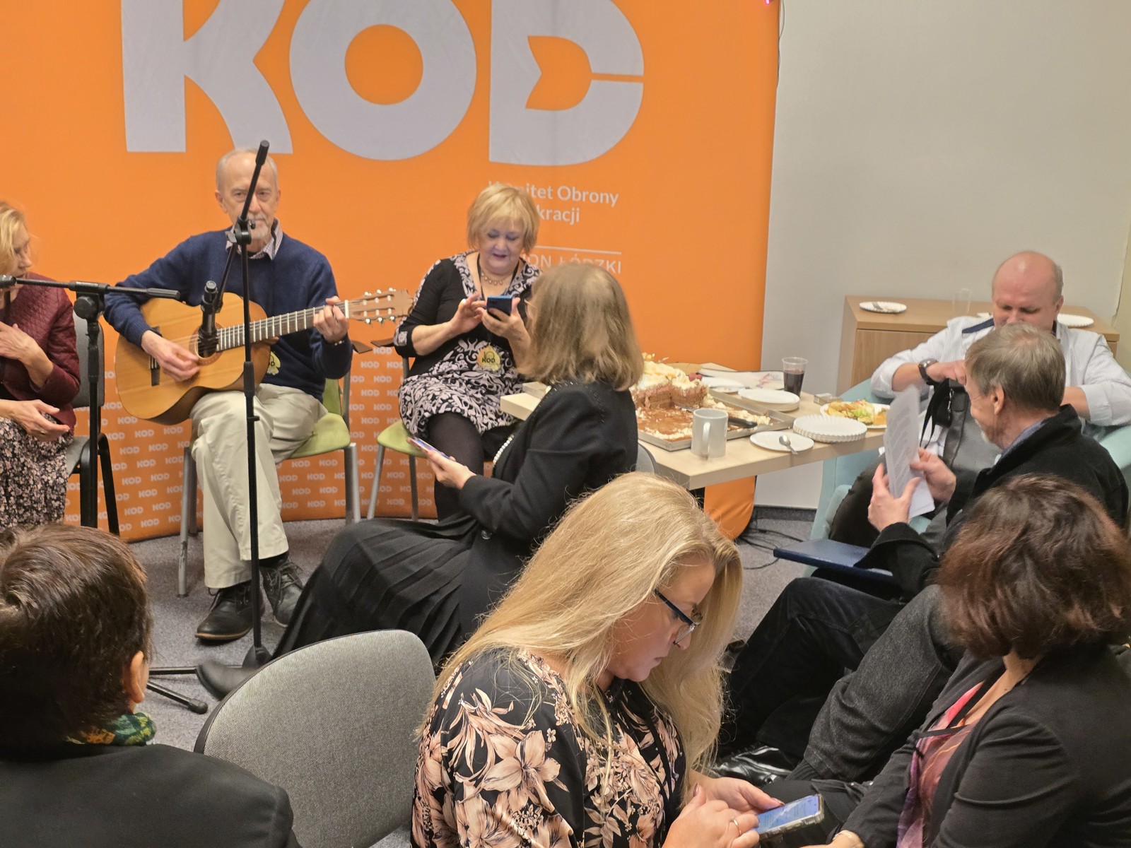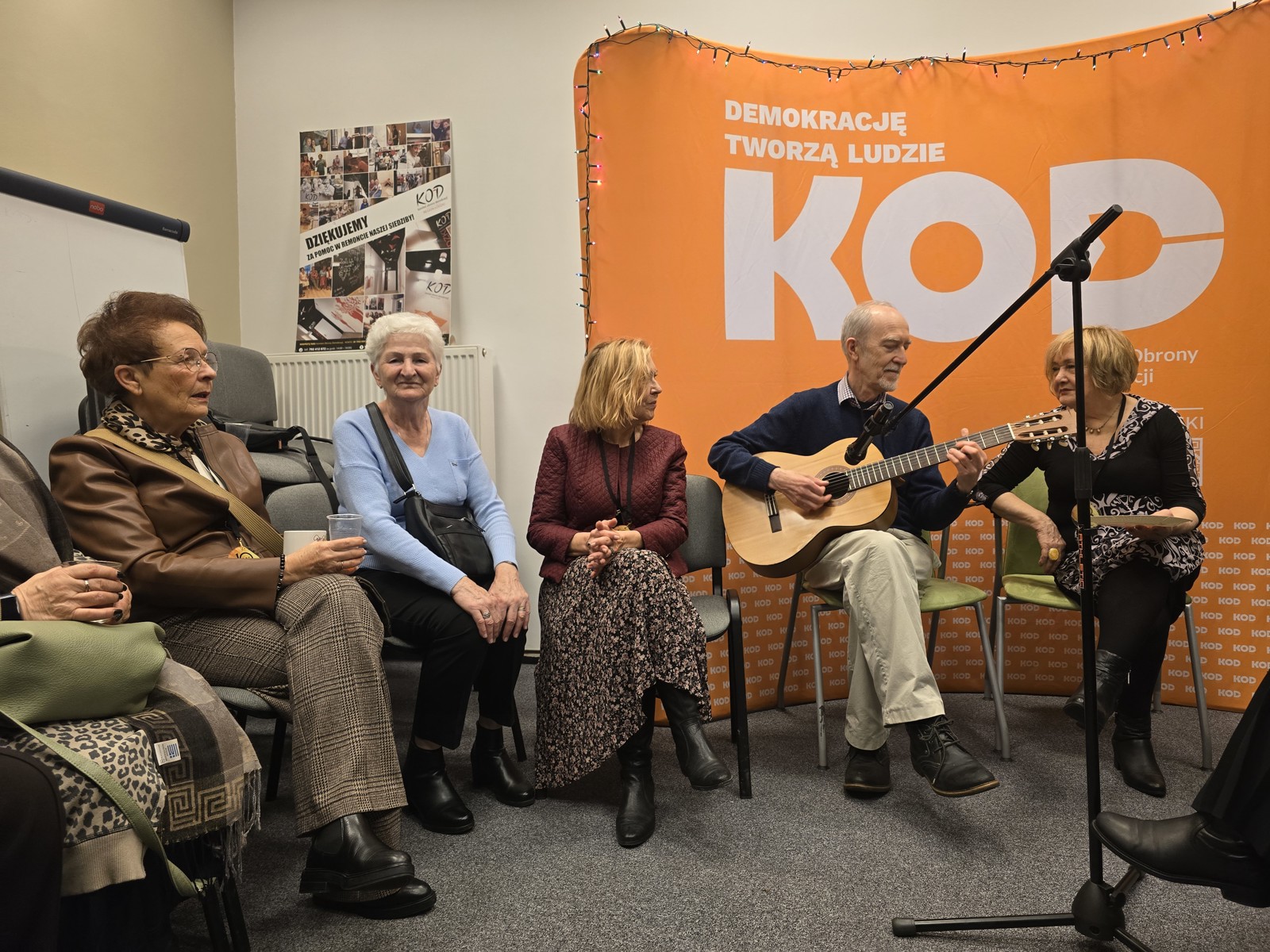 Postanowiliśmy uczcić ten jubileusz również lokalnie, stąd pomysł na połączenie tradycyjnego spotkania przedświątecznego z obchodami rocznicowymi. Część (prawie) oficjalną zaczęliśmy od podziękowania dla małżeństwa, które od 20 lat nieprzerwanie pracuje na rzecz KODu. Oczywiście chodzi o niezmordowanych i niezastąpionych Małgosię i Mirka Michalskich. Jurek Morka wygłosił na ich część piękne laudacje a senator Artur Dunin wraz z małżonką przybyli z gratulacjami (i kalendarzami). Później były śpiewy, przy akompaniamencie Lucjana Wesołowskiego z gitarą, wspomnienia, rozmowy na szczycie i praca u podstaw też. Byli ludzie, którzy są od początku i tacy, którzy trafili do KODu stosunkowo niedawno (nawet jedna zbłąkana owca wróciła na łono po kilku latach bez kontaktu).
